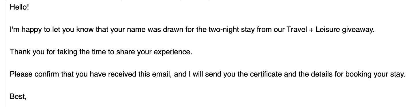 I thought back to my Law of Attraction group. The people always encourage leaning into opening yourself up to all the fun and unexpected ways the universe can treat you. I started imaging staying in a beautiful hotel and watched the tour videos to put myself physically there. It can be easy, I told myself. Then I signed up for the newsletter which asked participants to do a survey. As a thank you, they’d enter you into a giveaway.